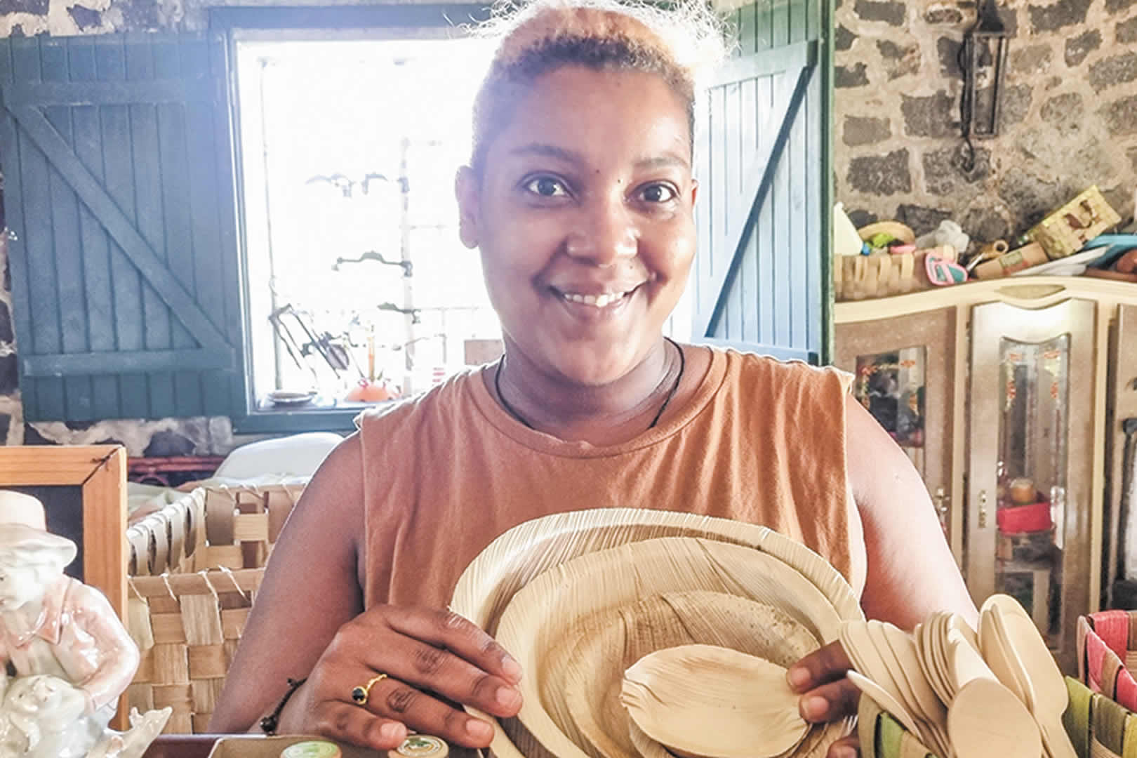 À Fey Palmiste, nous rencontrons Francesca Calotte. La spécialité de cette femme passionnée et dévouée à son métier : les assiettes en feuilles de palmiers. Ces assiettes permettent-elles d’éviter de faire la vaisselle ? Francesca Calotte éclate de rire. « Nos assiettes peuvent être rincées, réutilisées et séchées », répond-elle.