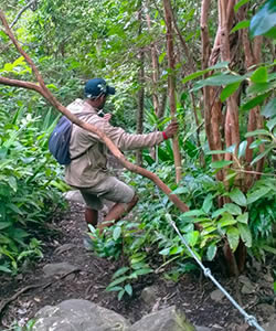 Notre ascension de la montagne se fait tantôt en s’agrippant aux cordes tantôt en s’accrochant aux feuilles et tiges des arbres ou encore au creux des rochers sur les pentes. Enfin nous voilà au sommet de Piton Canot, qui est aussi l’un des parcours du Dodo Trail.