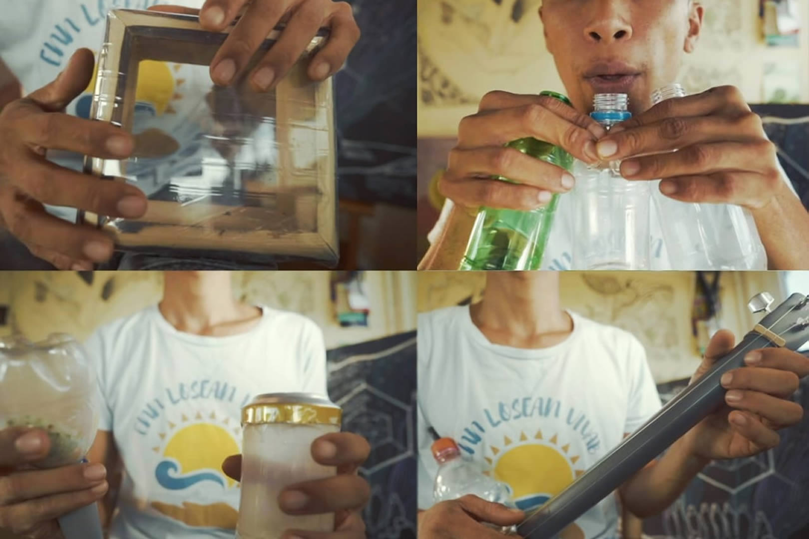 Kan Chan Kin est un artiste que nous ne présentons plus. Après avoir eu une carrière de DJ, il s’est lancé dans la musique acoustique. Aujourd’hui il fabrique des instruments musicaux à base de matériaux recyclés. C’est sa façon à lui de réduire les déchets. En 2017 il a fondé le mouvement EnnLoseanVivab avec des activistes. Pour lui le upcycling, la réutilisation des déchets est un concept qui doit être propagé.
