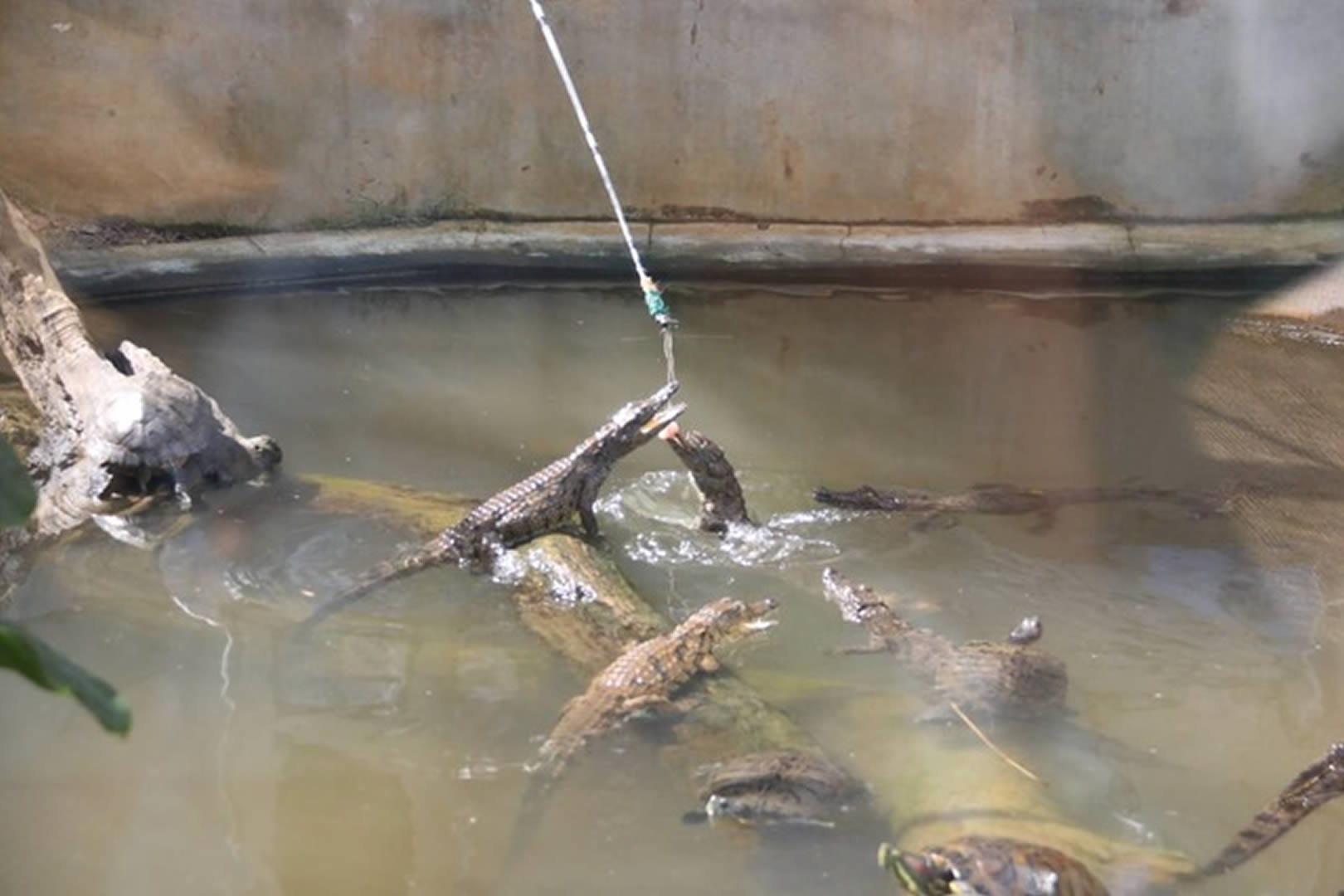 Au bassin des bébés crocodiles, les visiteurs peuvent les nourrir à l’aide d’une canne à pêche avec du poulet ou de la viande comme appât.