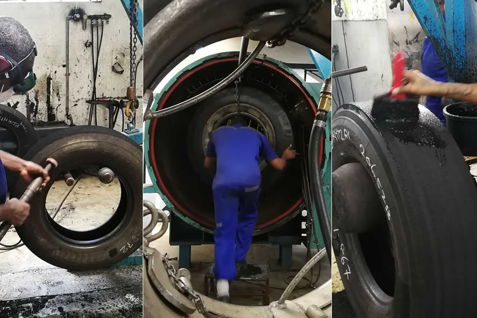 • À chaque fois qu’un pneu est rechapé, la marque et les écritures se trouvant sur celui-ci sont enlevées. L’ouvrier cherche aussi des objets qui pourraient compromettre le processus.