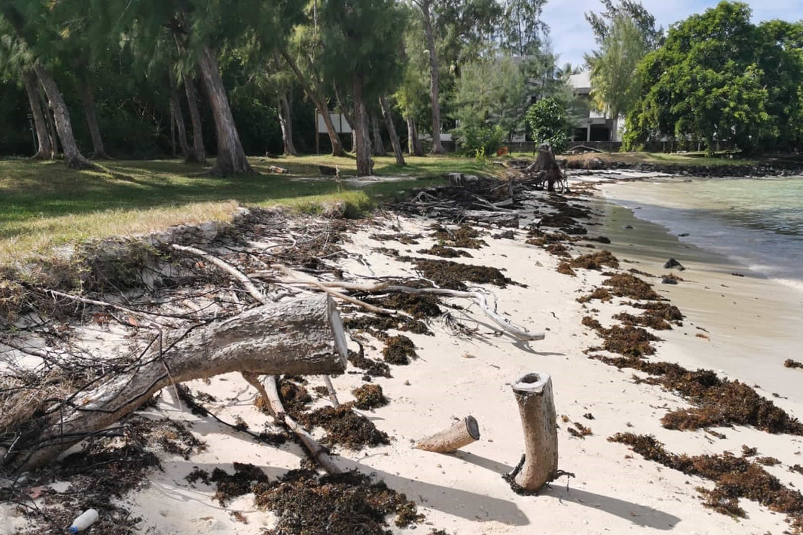 Alors que le lagon se repose, les intempéries n’épargnent pas la plage. La pandémie capte notre attention et pendant ce temps, un autre fléau continue à nous frapper : le changement climatique et ses effets. La plage de Poste-Lafayette est érodée au point que les racines des arbres sont mises à nu. Cependant, cette partie de l’île conserve son côté sauvage et attirant.